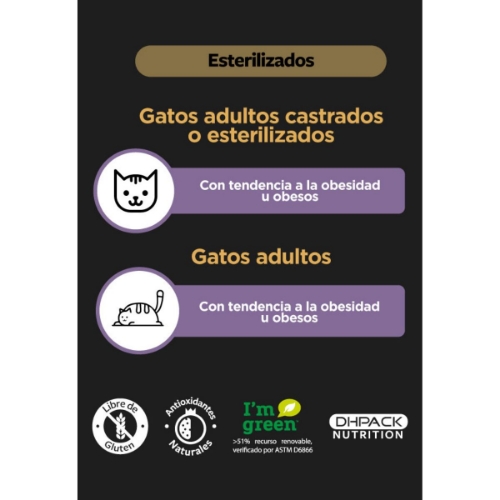 Agility Gold Gatos Esterilizados es un alimento completo y balanceado especialmente diseñado para cubrir las necesidades nutricionales de gatos esterilizados o castrados. Un alimento que le ayudará a la movilización de grasas y reducción calórica, lo nutrirá con ingredientes súper premium y favorecerá la salud renal y el mantenimiento de un pelo saludable.