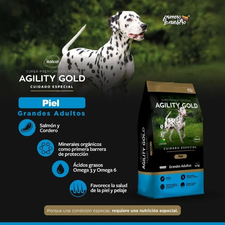 Agility Gold Piel Grandes Adultos es un alimento súper premium especialmente diseñado para perros adultos de razas medianas y grandes que buscan una piel sana y un pelaje brillante. Contiene pulpa de remolacha y yucca schidigera que mejoran la consistencia y ayudan a controlar el olor de las heces. Su fórmula única, rica en proteínas de alta calidad como el salmón y el cordero, junto con ácidos grasos esenciales Omega 3 y 6, vitaminas del complejo B, minerales orgánicos y antioxidantes naturales, brinda una nutrición completa y balanceada que nutre la piel desde adentro hacia afuera, promoviendo: