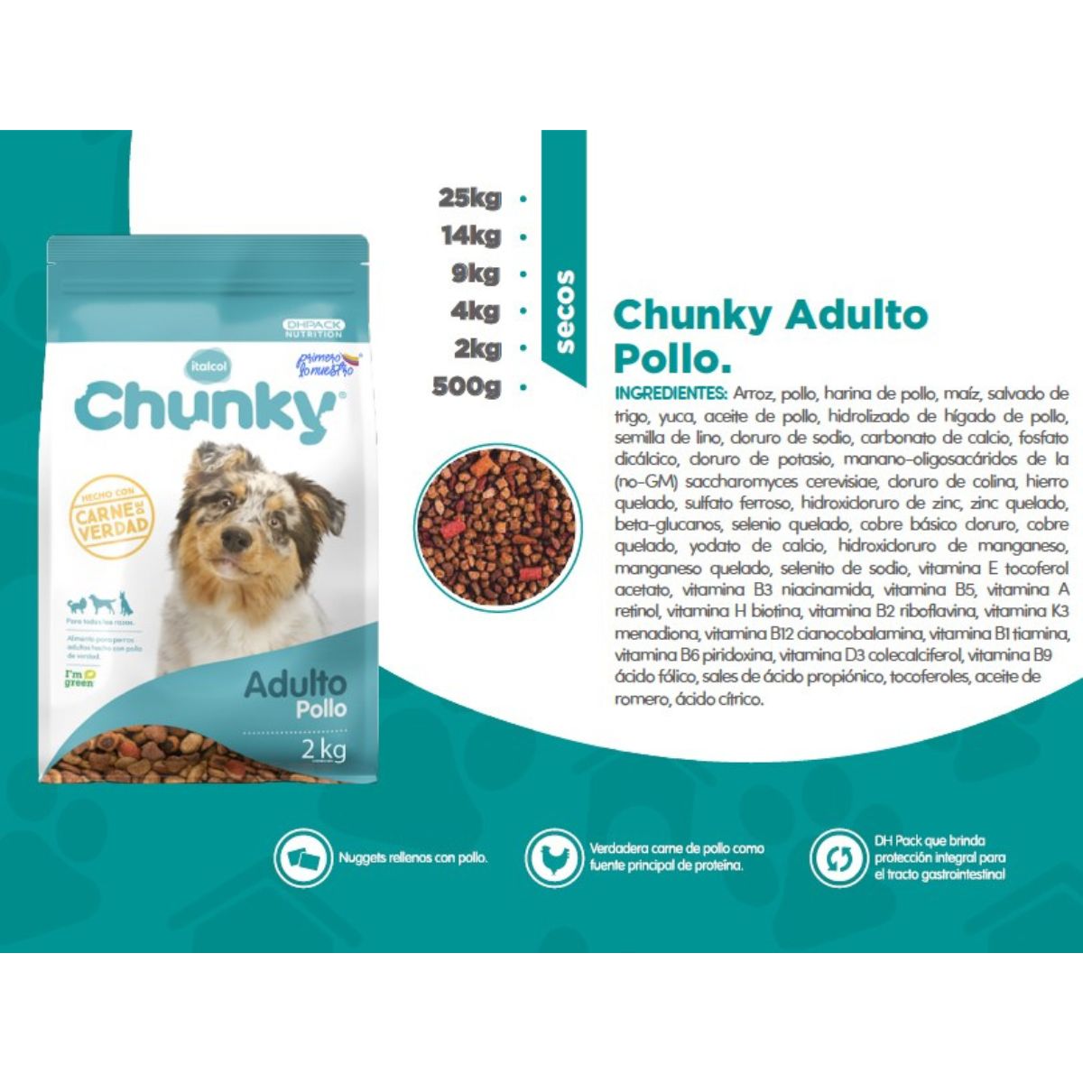 Dale a tu perro una alimentación equilibrada y deliciosa con Chunky Adulto Pollo. Este alimento, hecho en Colombia, está elaborado con carne real de pollo, ofreciendo una fuente de proteína de alta calidad que apoya el desarrollo muscular y la salud general de tu mascota.