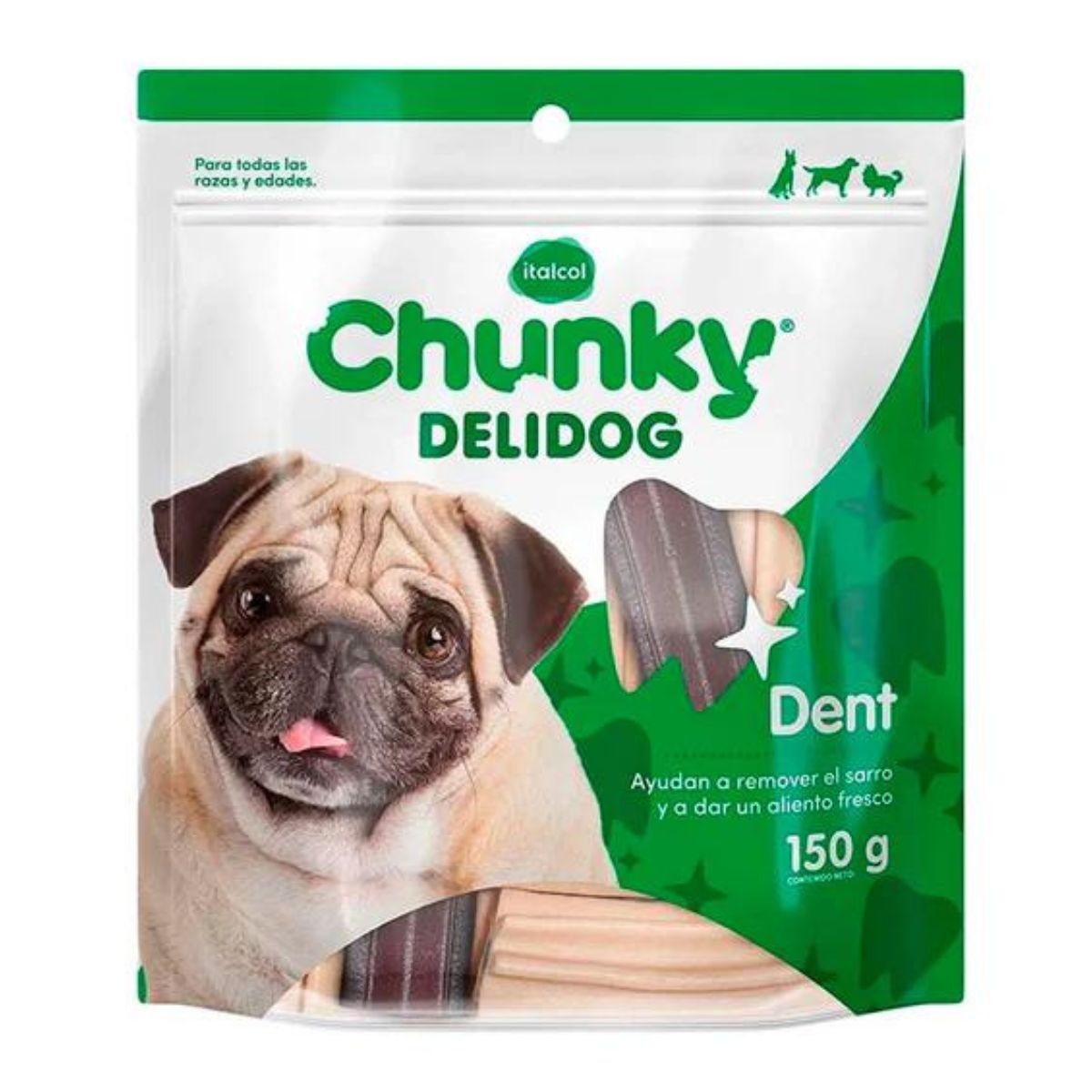 Mantén la sonrisa de tu perro radiante y su aliento fresco con Chunky Delidog Dent, el snack ideal para mantener a tu perro entretenido y contribuir a la salud dental de tu mascota. Su fórmula especial y textura única ayudan a remover los restos de comida en los dientes, reduciendo la acumulación de sarro y promoviendo un aliento fresco.