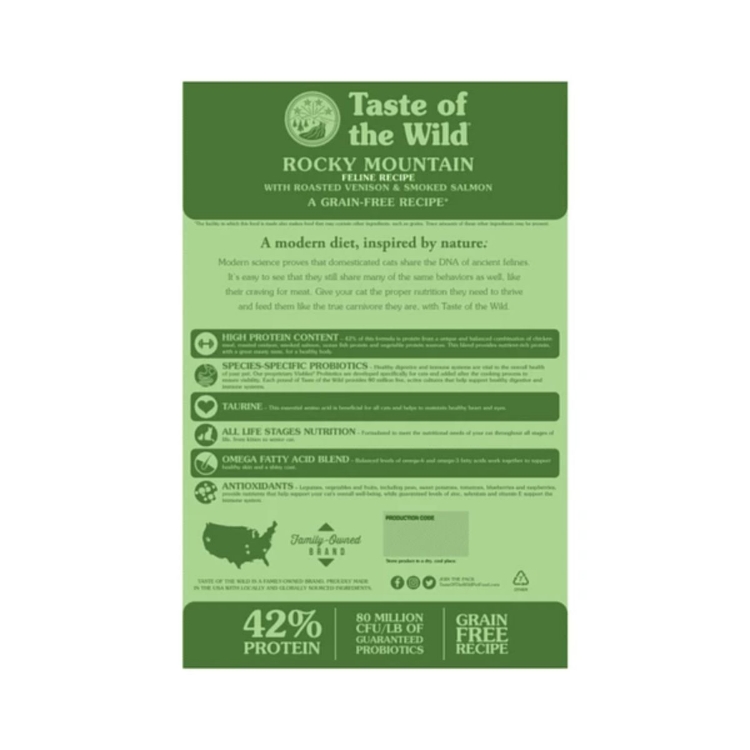 Inspirado en la dieta ancestral de los felinos, Taste of the Wild Rocky Mountain – Feline Recipe ofrece una nutrición completa y equilibrada para tu gato. Con una impresionante fórmula que contiene un 42% de proteína de venado asado y salmón ahumado, este alimento proporciona la energía y los nutrientes esenciales para un cuerpo sano y fuerte. Enriquecido con frutas, verduras y probióticos, favorece una digestión saludable y un sistema inmunológico robusto. ¡Despierta los sentidos de tu gato con el sabor salvaje de Taste of the Wild!»